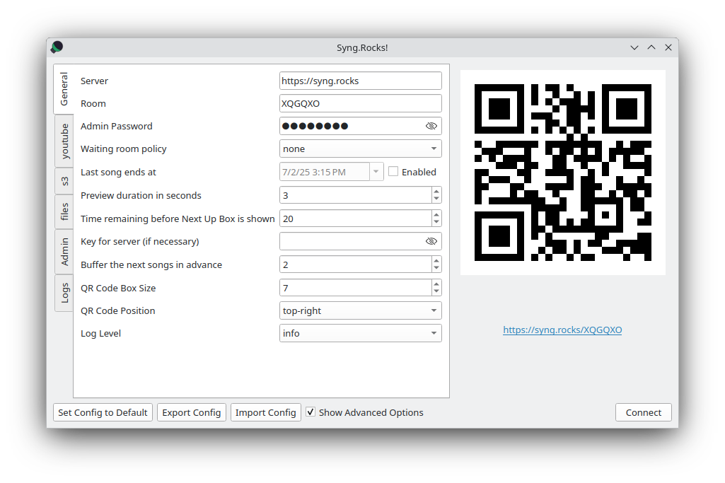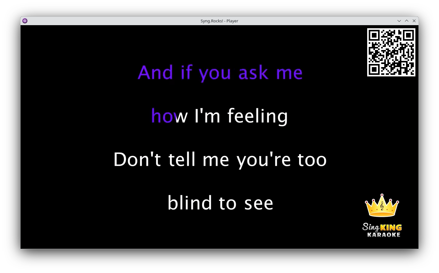 Syng.Rocks! is an all-in-one karaoke software, consisting of a backend server, a web frontend and a playback client. Karaoke performers can search a library using the web frontend, and add songs to the queue. The playback client retrieves songs from the backend server and plays them in order.